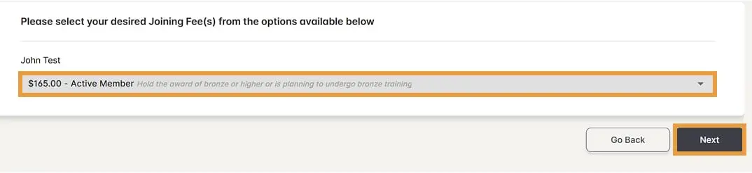 Select the Active Member fee type and payment amount . Then click Next.