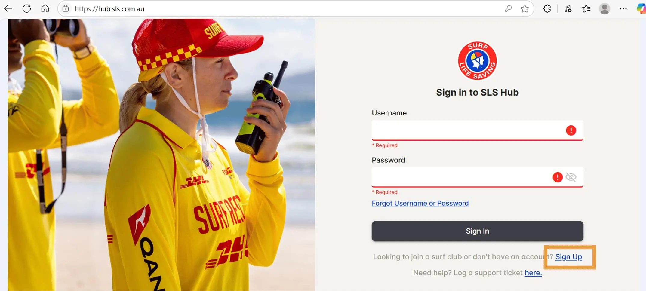 Create a new account on the SLS Hub at https://hub.sls.com.au by clicking on the Sign Up link under the Sign In button.