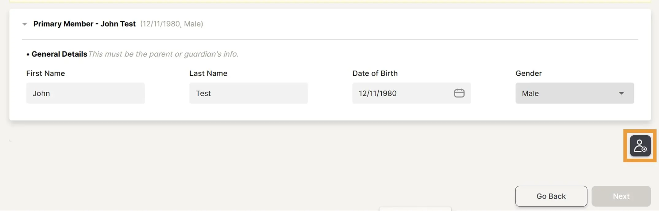 Enter details of members – Primary Member is the main parent for the group. Once Primary Member details are completed, click on the Add member icon to add the next member.