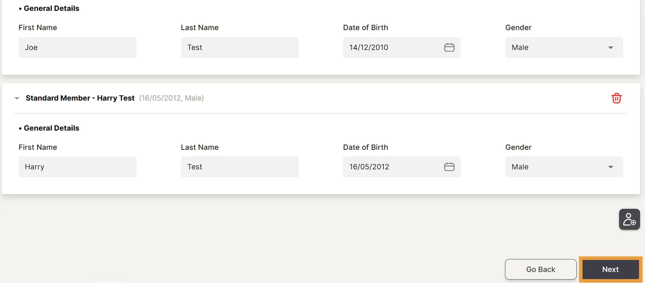 Complete all details for all members required to be added, then click Next.