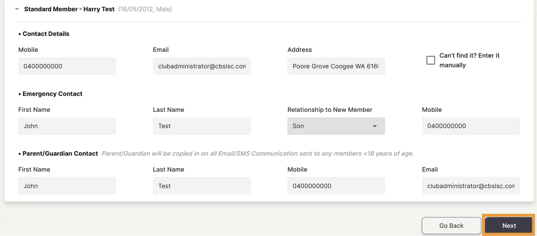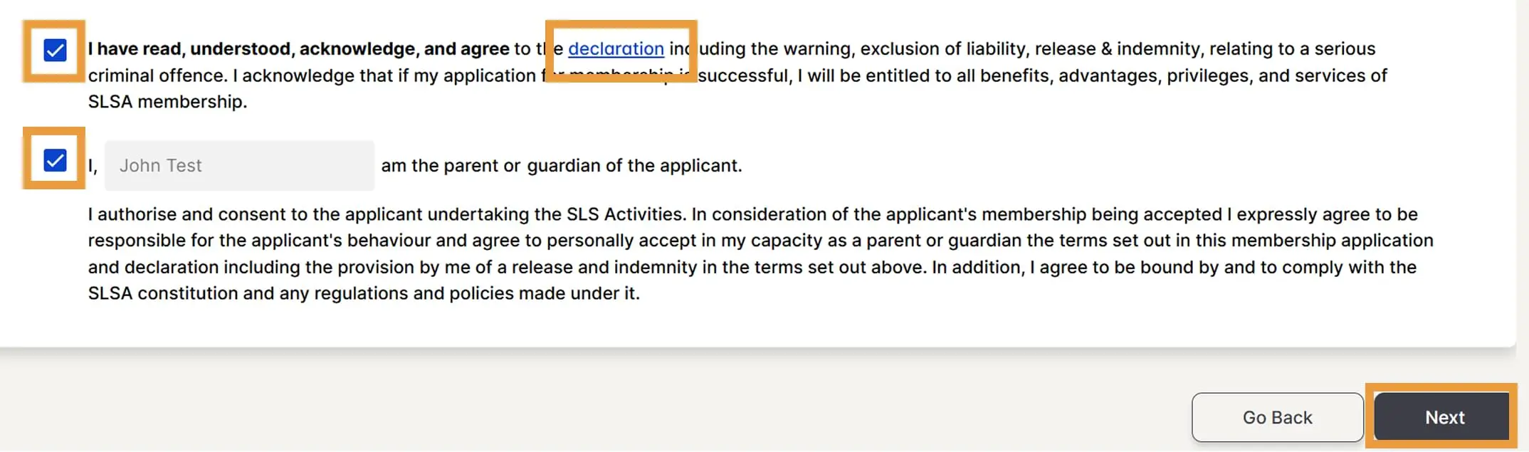 Tick the member declaration to acknowledge it and select Next. Note, if you are under 18 years old, an additional declaration will show and must be ticked/acknowledged by your parent/guardian.
