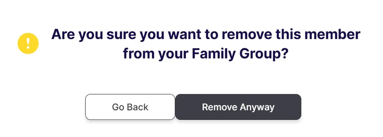 Remove a family member: Click on the three dots next to the member name, then click Remove Family Group Member, that you wish to remove. Click on Remove Anyway if you agree or click on Go Back if you wish to cancel the removal. Repeat for all members you wish to remove.