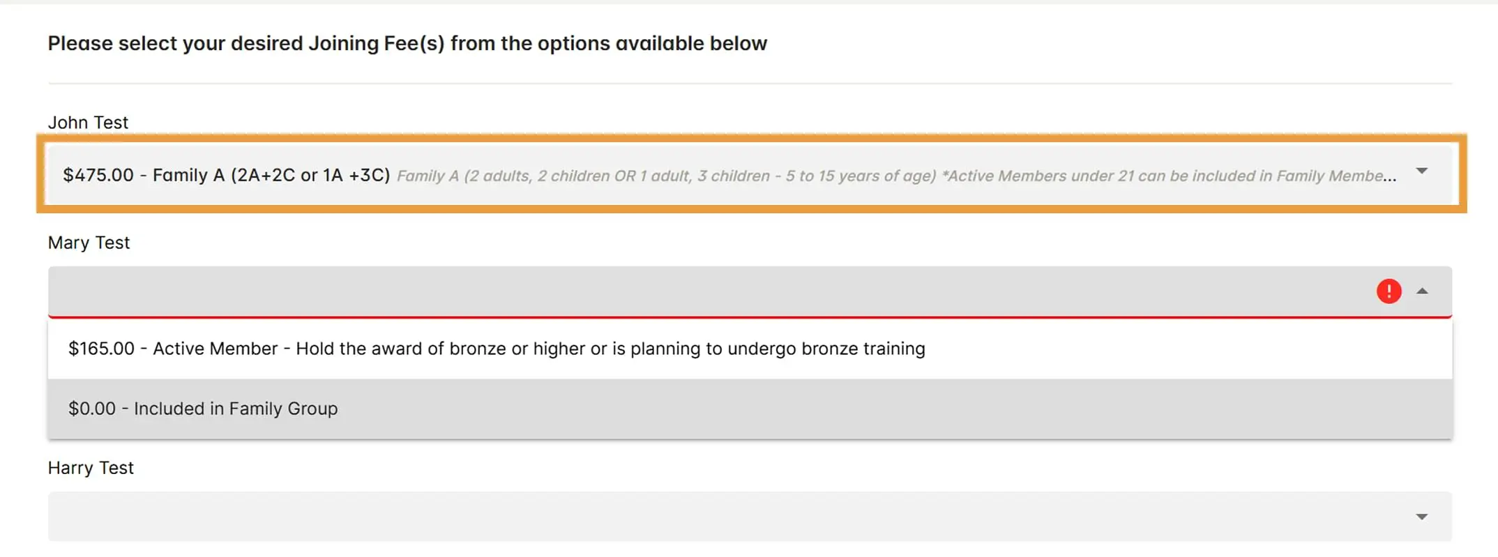 Select your joining fee applicable – Family A (4 members total), Family B (3 members), Family C (2 members). Select the Family group amount on the first member only, the other members will then display ‘$0.00 – Included in Family Group’.