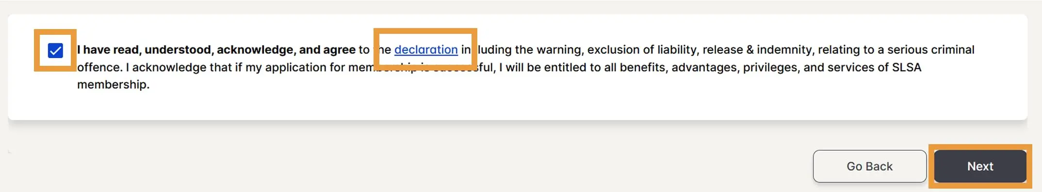 Click on the declaration hyperlink and read the terms and conditions. Once read and you agree, tick the checkboxes to acknowledge and agree to the declaration. Then click Next.